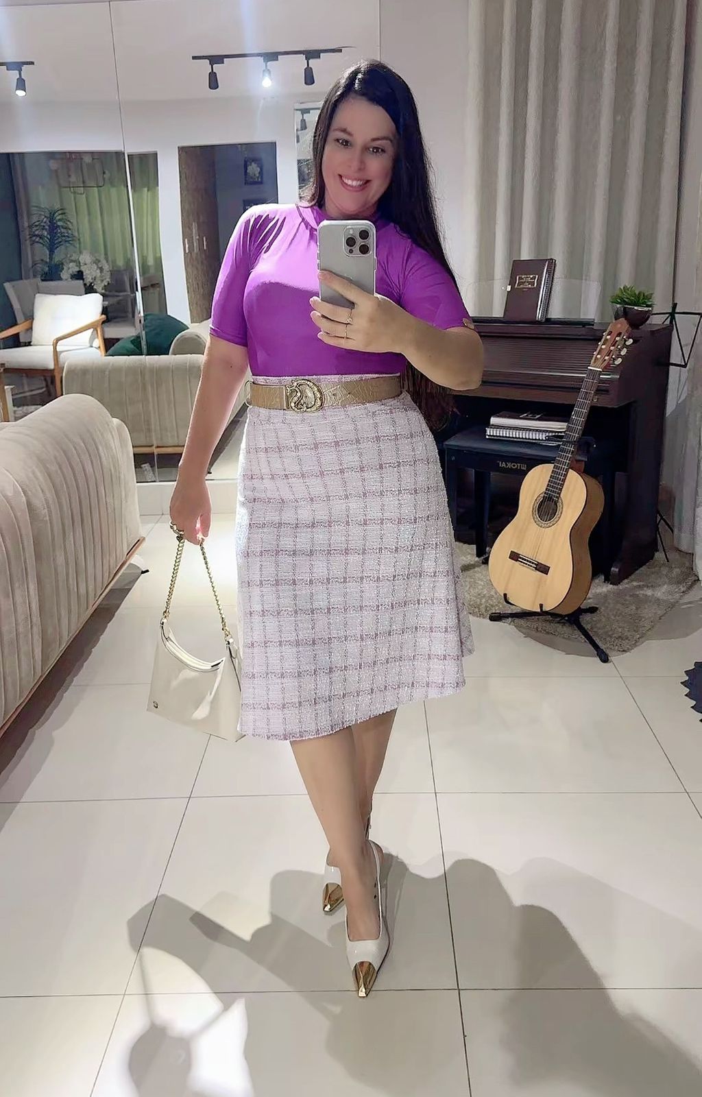 CONJUNTO BLUSA GOLA ALTA MANGA MEDIA EM FLUIT E SAIA MIDI EVASÊ EM TWEED!!
